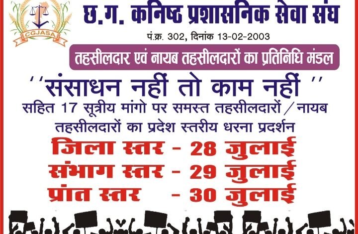 छत्तीसगढ़ कनिष्ठ प्रशासनिक सेवा संघ के बैनर तले प्रदेश के समस्त तहसीलदार एवं नायब तहसीलदार “संसाधन नहीं तो काम नहीं” के नारे के साथ अपनी 17 सूत्रीय मांगों को लेकर चरणबद्ध आंदोलन के तहत धरना-प्रदर्शन करने जा रहे हैं।