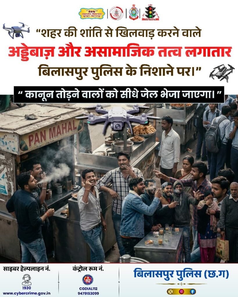 Bilaspur News : – बिलासपुर। शहर की गलियों में जो गतिविधियां अब तक पुलिस की गश्त से छूट जाया करती थीं, वे अब आसमान से साफ दिखाई दे रही हैं। नशे की पुड़िया, अड्डेबाजी के कोने और शाम ढलते ही जुटने वाली भीड़—अब सब पर ड्रोन की नजर है। इस निगरानी को दफ्तर में बैठकर खुद एसएसपी रजनेश सिंह देख रहे हैं और उसी के आधार पर पुलिस टीमों को तुरंत मौके पर भेजा जा रहा है।