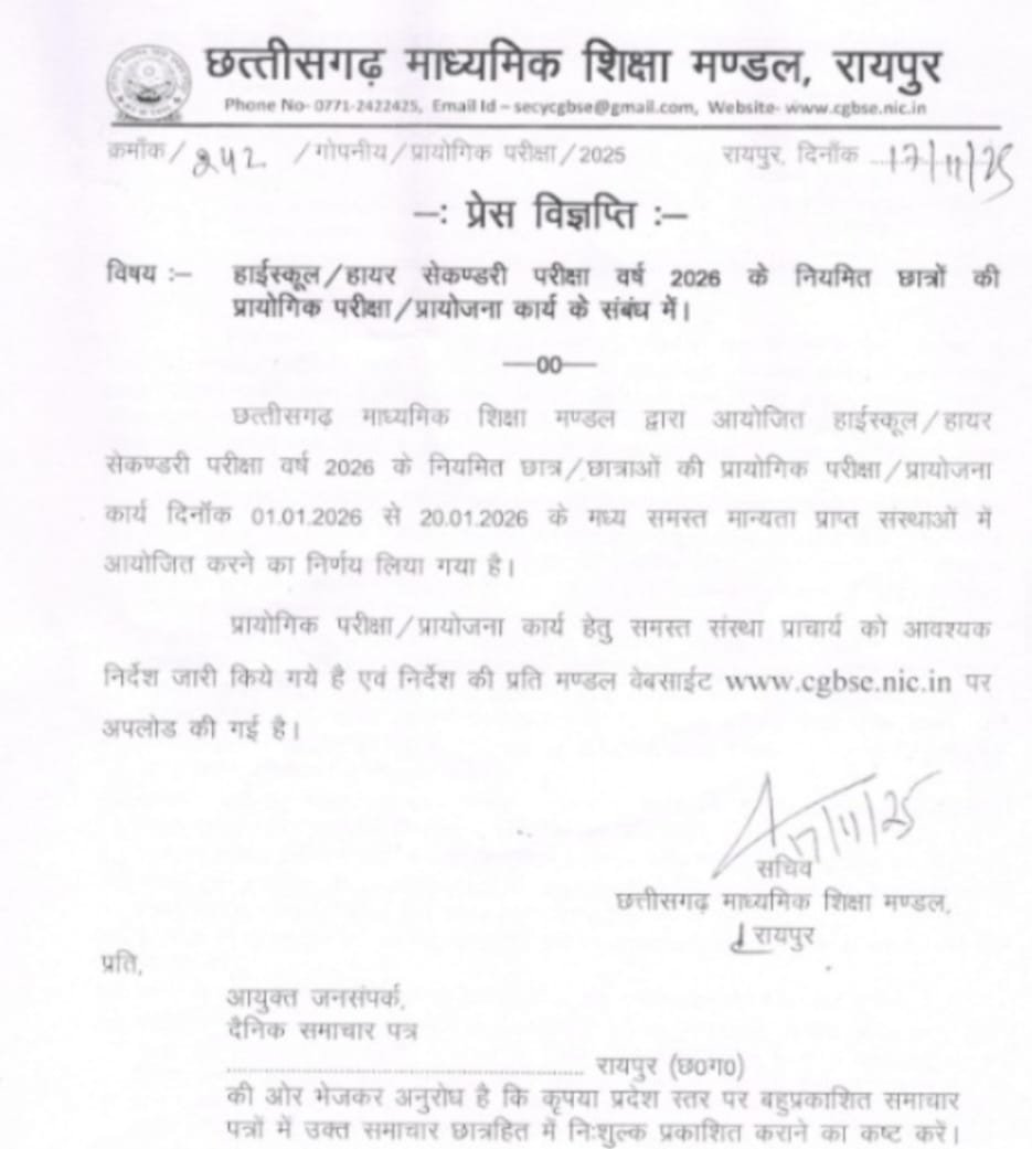 रायपुर।छत्तीसगढ़ माध्यमिक शिक्षा मंडल (CGBSE) ने बोर्ड परीक्षा के प्रायोगिक (प्रैक्टिकल) एग्जाम के आयोजन को लेकर महत्वपूर्ण घोषणा की है। मंडल ने निर्णय लिया है […]