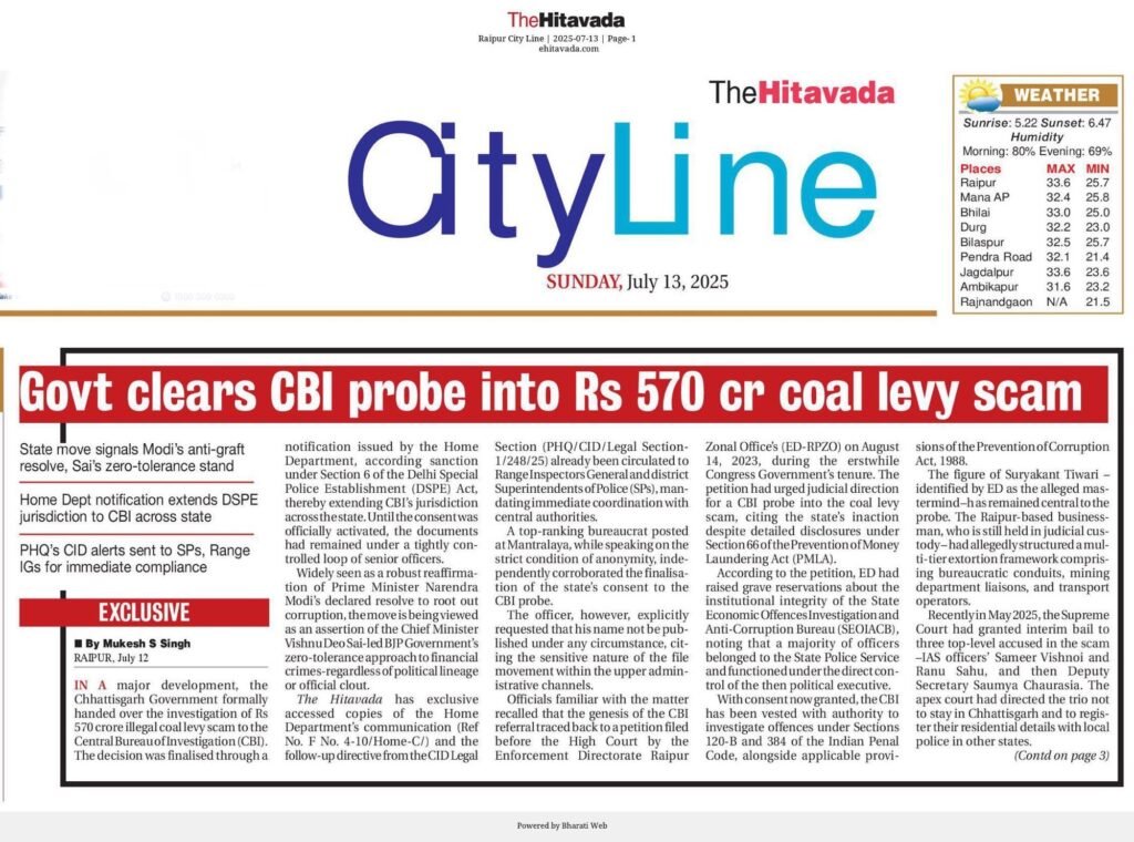 Raipur News: रायपुर ।छत्तीसगढ़ राज्य में 570 करोड़ रुपये के बहुचर्चित कोल लेवी घोटाले की जांच अब पूरी तरह से CBI के हाथों में सौंप दी गई है। इस फैसले ने न सिर्फ सियासी गलियारों में हलचल मचा दी है, बल्कि पूरे प्रशासनिक ढांचे को सकते में डाल दिया है।