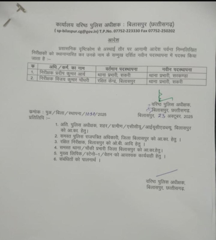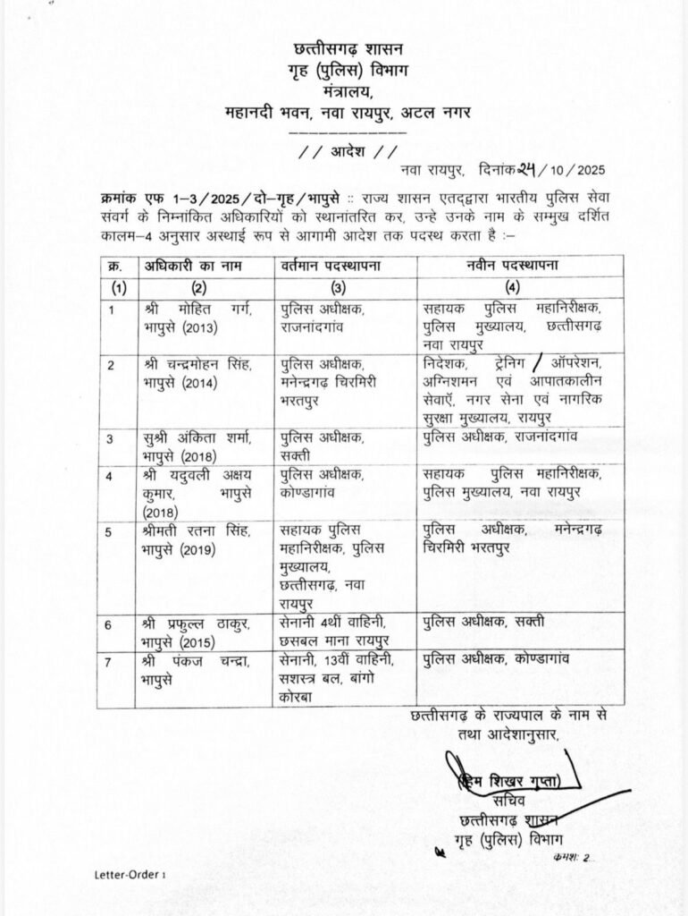 CG IPS Transfer News:–आईपीएस अफसरों के हुए तबादले, बदले गए पुलिस अधीक्षक