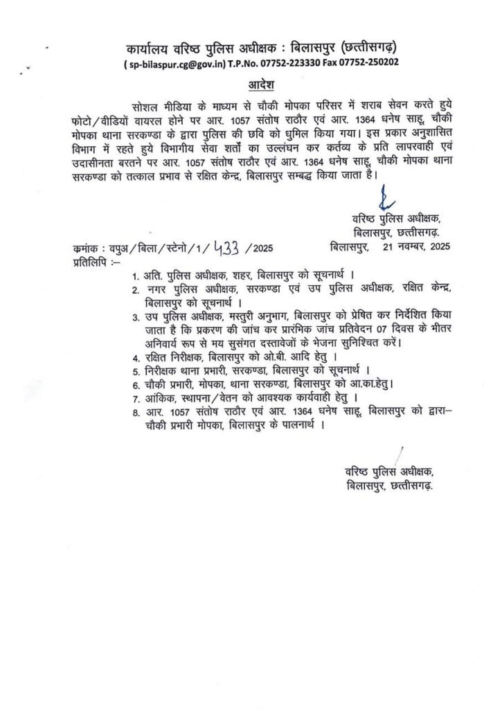 जैसे ही वीडियो सोशल मीडिया में वायरल हुआ, पुलिस विभाग की कार्यप्रणाली पर सवाल खड़े होने लगे। मामला एसएसपी तक पहुंचते ही उन्होंने आरक्षक क्रमांक 1057 संतोष राठौर और आरक्षक क्रमांक 1364 धनेश साहू—दोनों पदस्थ मोपका चौकी, थाना सरकंडा—को विभागीय प्रतिष्ठा को नुकसान पहुंचाने, अनुशासनहीन आचरण और कर्तव्य में लापरवाही के आरोपों में लाइन अटैच कर दिया।