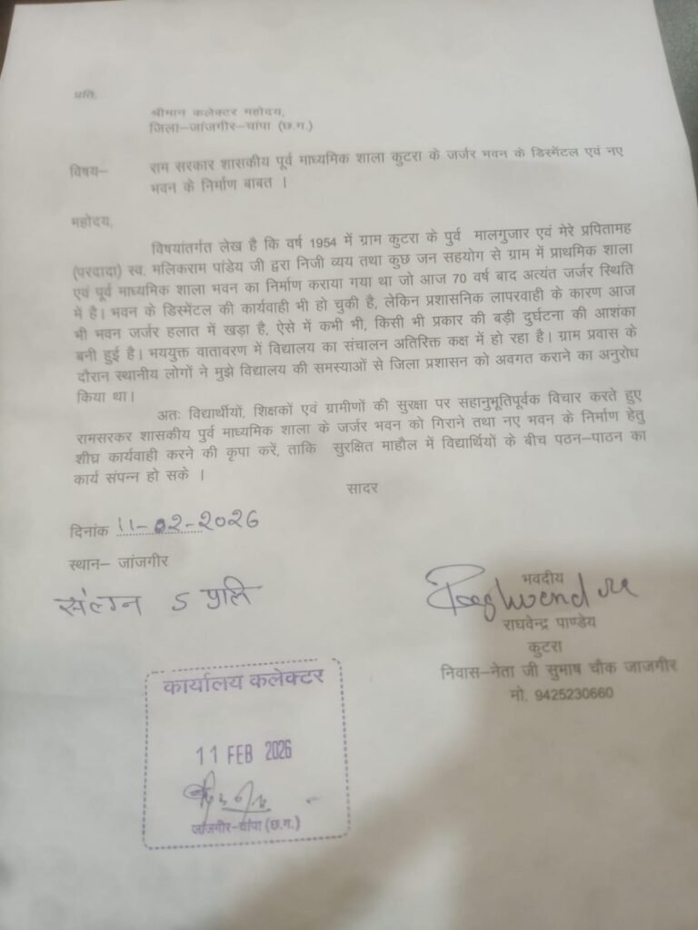 CG News:– जांजगीर–चांपा। ग्राम कुटरा इन दिनों स्वास्थ्य सुविधाओं के विस्तार को लेकर चर्चा में है। यहां अस्पताल और मेडिकल कॉलेज का निर्माण कार्य तेजी से चल रहा है। लेकिन इसी गांव में शिक्षा व्यवस्था की एक चिंताजनक तस्वीर भी सामने है। रामसरकार शासकीय पूर्व माध्यमिक शाला का लगभग 70 वर्ष पुराना भवन अब जर्जर अवस्था में पहुंच चुका है, जिससे बच्चों की सुरक्षा को लेकर गंभीर सवाल उठ रहे हैं।
