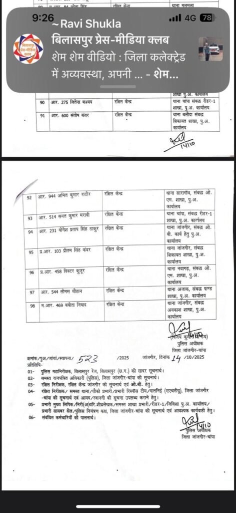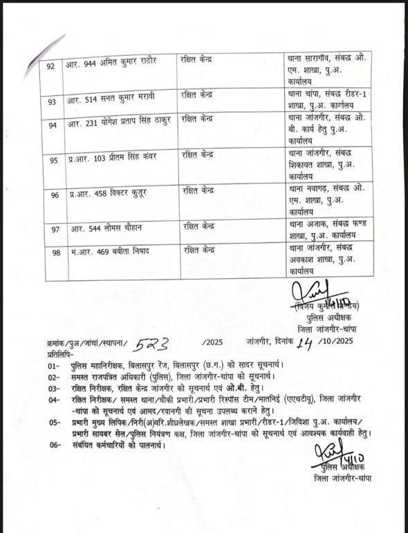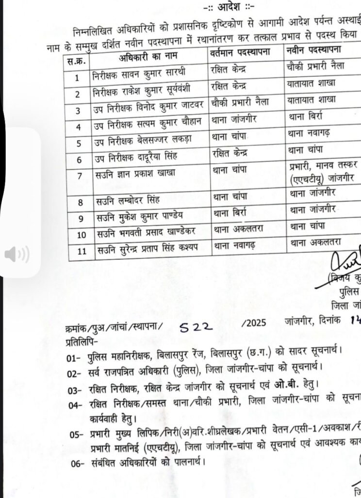 जांजगीर-चांपा:– छत्तीसगढ़ के जांजगीर-चांपा जिले में एसपी विजय कुमार पांडेय ने व्यापक पुलिस प्रशासनिक बदलाव करते हुए थाना प्रभारी, एसआई, एएसआई, प्रधान आरक्षक और आरक्षक समेत कुल 108 पुलिसकर्मियों के नाम ट्रांसफर सूची में शामिल किए हैं। यह कदम जिले में बेहतर कानून-व्यवस्था और कार्यकुशलता सुनिश्चित करने के लिए उठाया गया है।