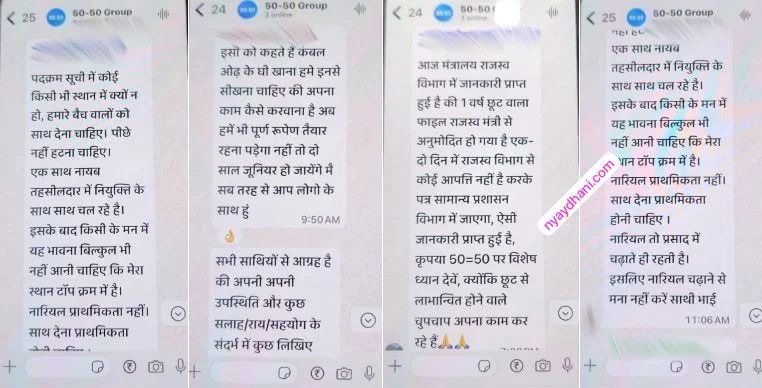 ‘50-50’ नामक एक व्हाट्सएप ग्रुप की बातचीत में कथित तहसीलदारों ने पदोन्नति को लेकर चल रही “प्रक्रिया” में कोडवर्ड्स में लेन–देन की चर्चा की है।