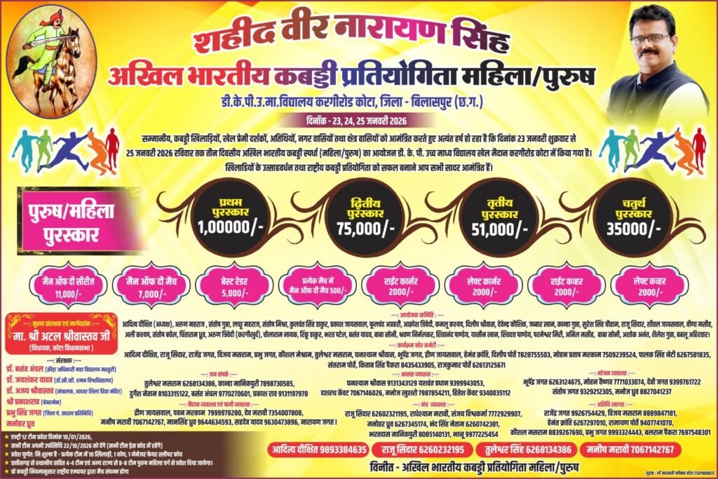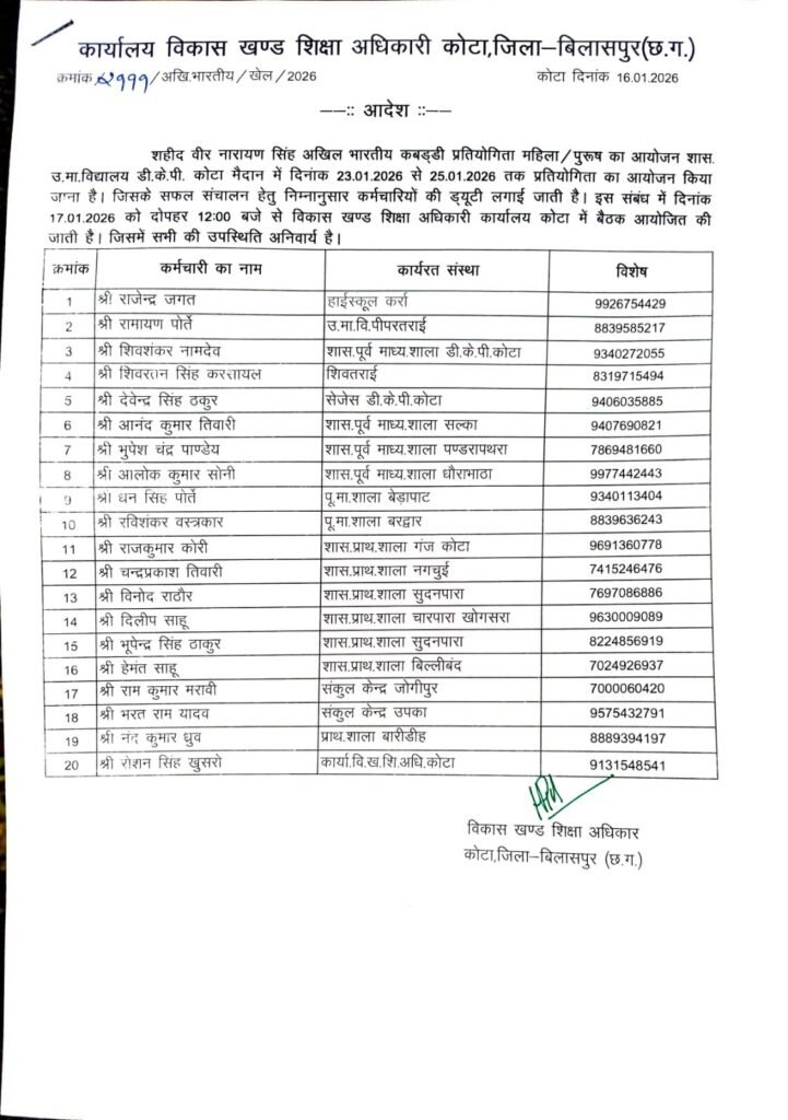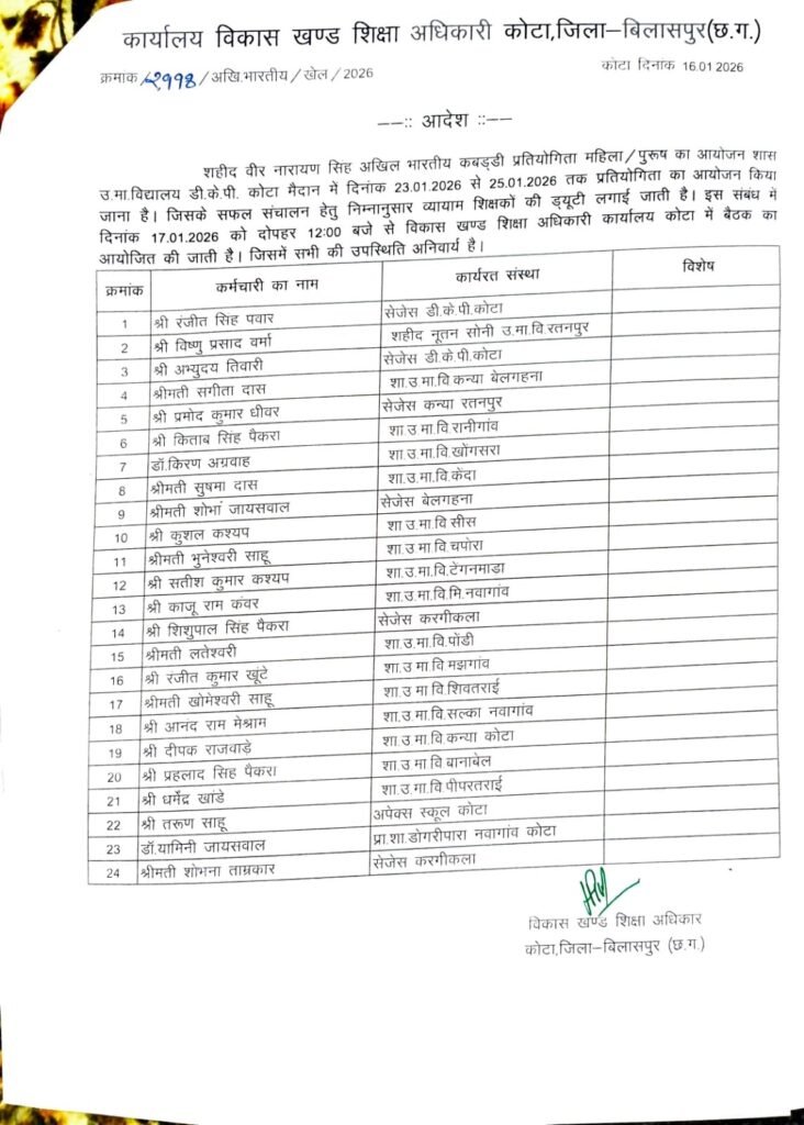 Bilaspur बिलासपुर । कांग्रेस विधायक के संरक्षण में हो रहे कबड्डी प्रतियोगिता में विकासखंड शिक्षा अधिकारी ने 24 व्यायाम शिक्षकों समेत 44 शिक्षकों और शिक्षा विभाग के कर्मचारियों की ड्यूटी लगाई है। प्री बोर्ड परीक्षाओं और बोर्ड कक्षाओं की प्रैक्टिकल परीक्षाओं के बीच कब्बड्डी में व्यायाम शिक्षकों के अलावा अन्य शिक्षकों की ड्यूटी लगने से पढ़ाई प्रभावित हो रही है।
