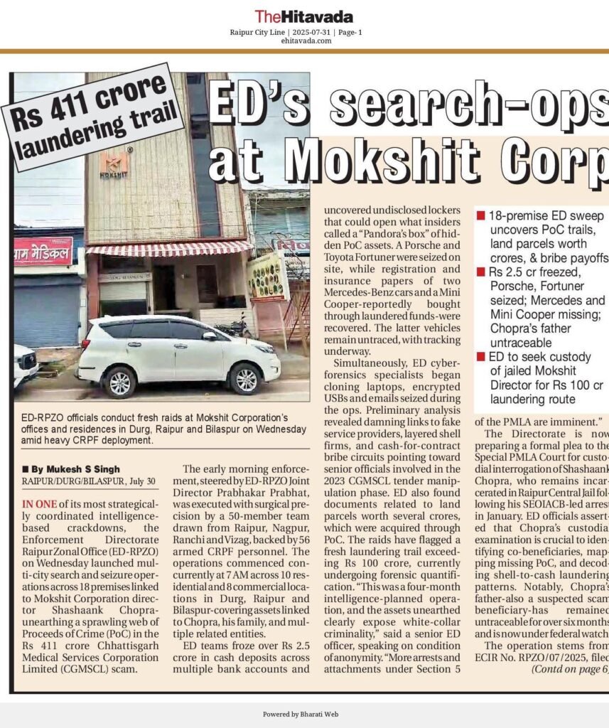छत्तीसगढ़ मेडिकल सर्विसेस कॉर्पोरेशन लिमिटेड (CGMSCL) घोटाले में प्रवर्तन निदेशालय (ईडी) ने बुधवार को मोक्शित कॉर्पोरेशन के निदेशक शशांक चोपड़ा से जुड़े 18 ठिकानों पर सघन तलाशी अभियान चलाकर लगभग 411 करोड़ के मनी लॉन्ड्रिंग नेटवर्क का पर्दाफाश किया।