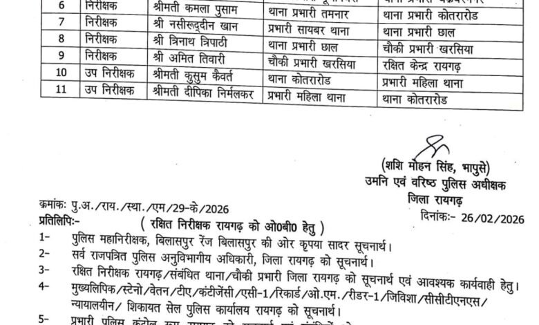 Raigarh रायगढ़। रायगढ़ जिले में वरिष्ठ पुलिस अधीक्षक शशिमोहन सिंह ने पुलिसिंग में कसावट के लिए होली से पहले 9 निरीक्षकों और दो उप निरीक्षकों के तबादला आदेश जारी किए हैं। अभिनव कांत सिंह को रक्षित केंद्र से थाना प्रभारी जूटमिल बनाकर भेजा गया है। इसी प्रकार कमला पुसाम  को तमनार से कोतरारोड थाना प्रभारी बनाया गया है। अन्य के भी देखें आदेश….
