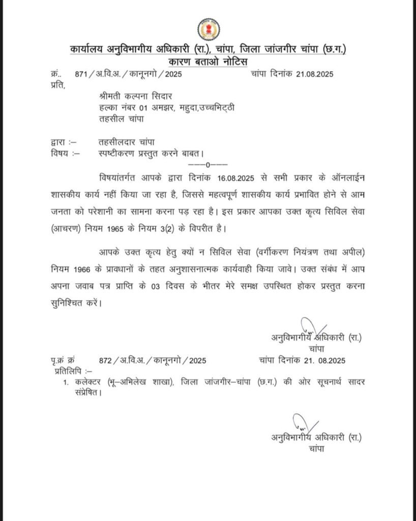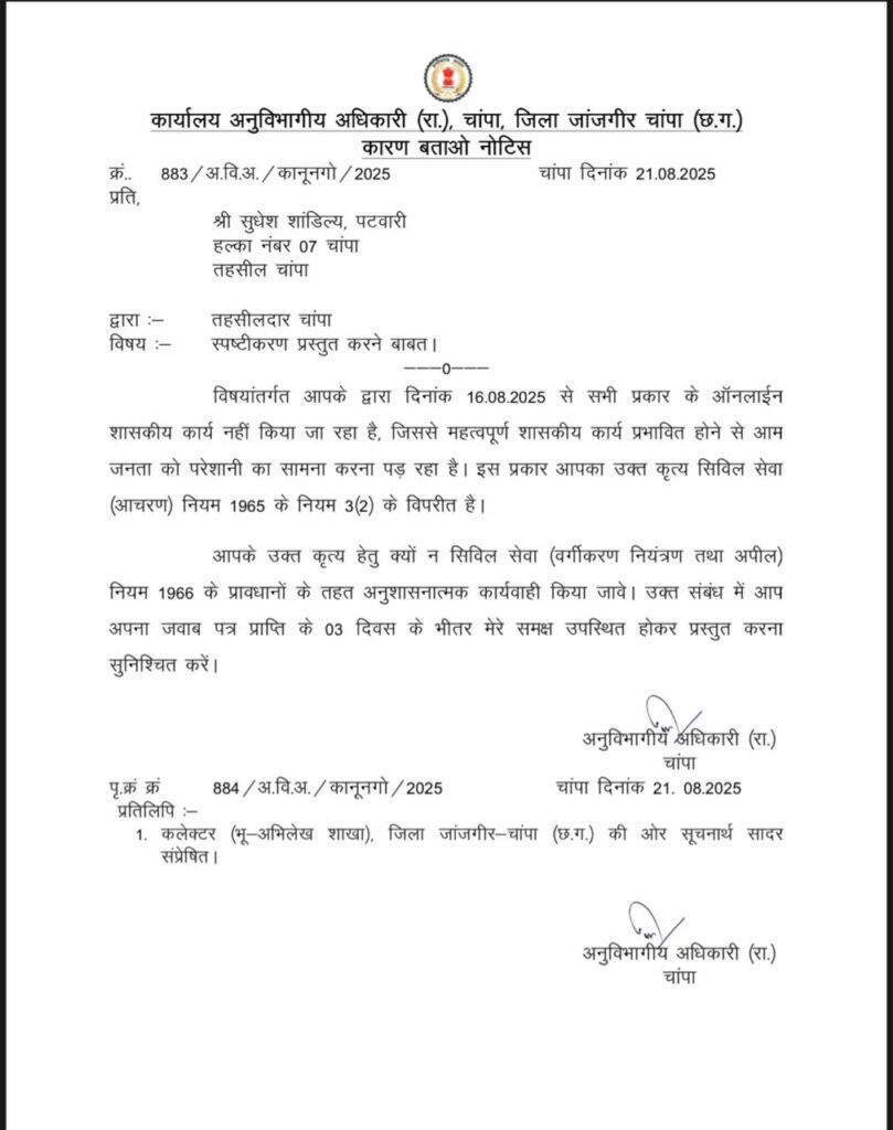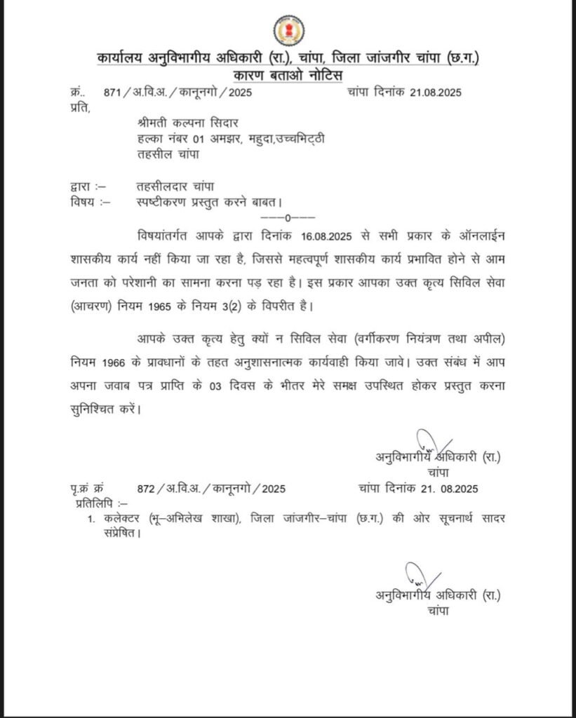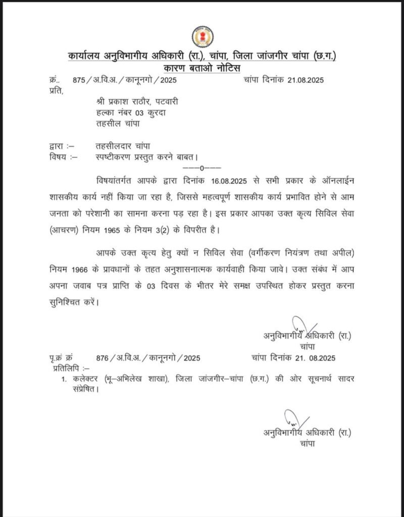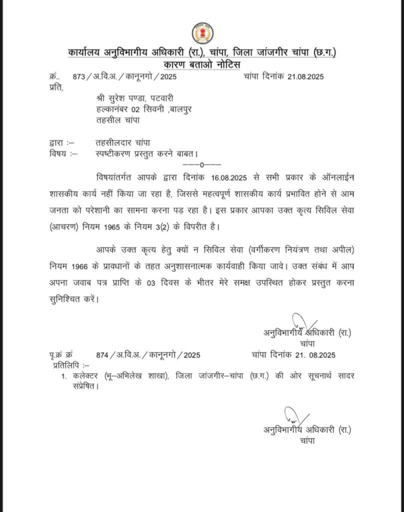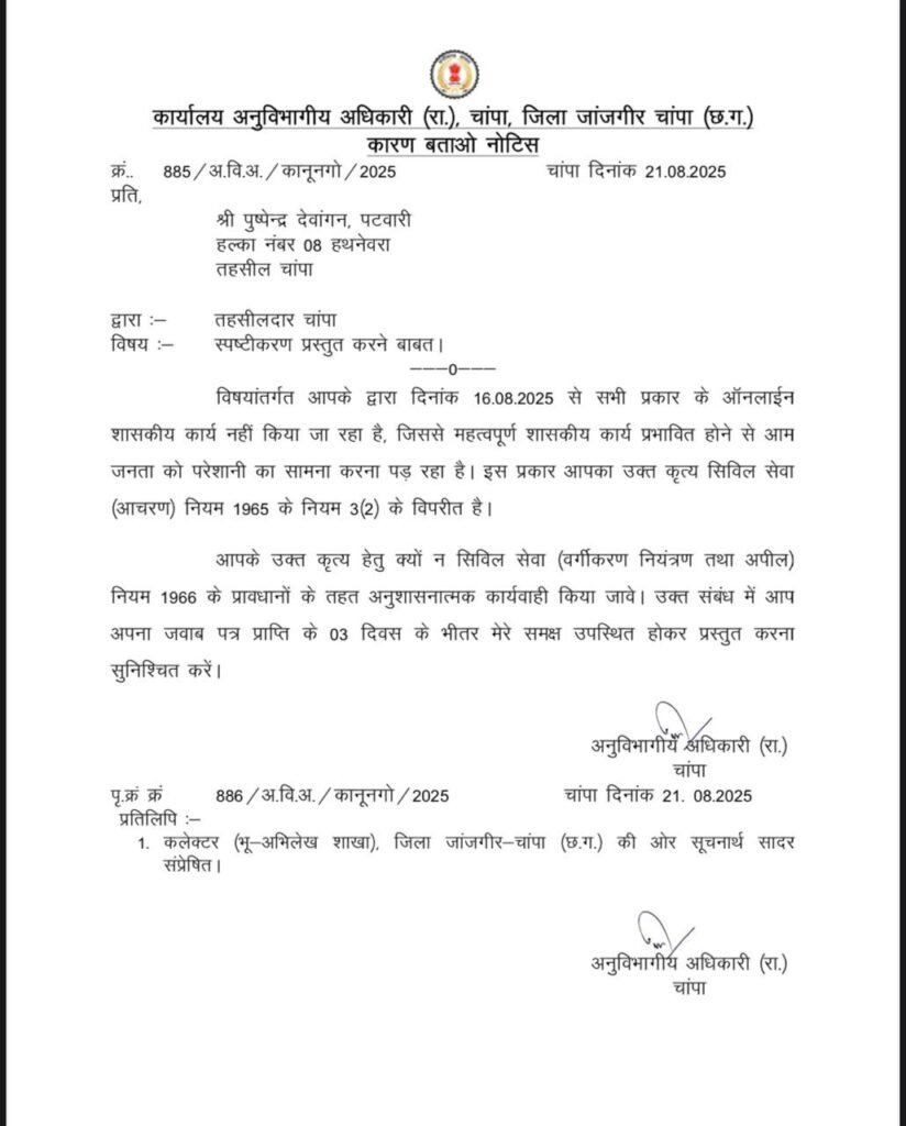 चांपा अनुविभाग क्षेत्र में ऑनलाइन कार्य बंद करने पर एसडीएम पवन कोसमा ने सख्त रुख अपनाया है। उन्होंने इस संबंध में पटवारियों को कारण बताओ नोटिस जारी किया है। नोटिस जिन पटवारियों को थमाया गया है, उनमें शामिल हैं –