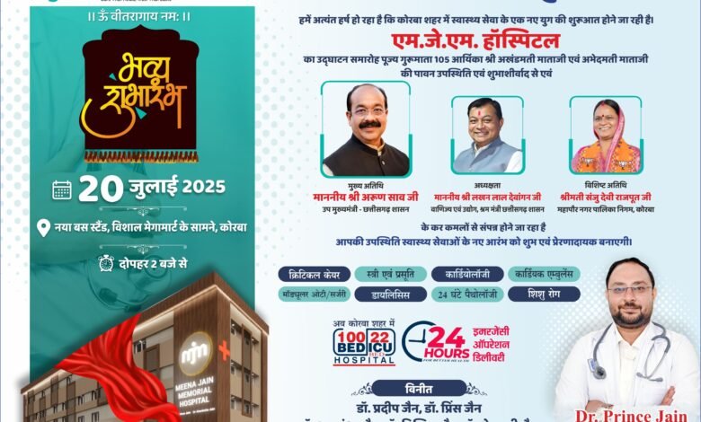 कोरबा – शहर की जनता को अब स्वास्थ्य सेवाओं के लिए रायपुर या बिलासपुर की ओर रुख नहीं करना पड़ेगा। 20 जुलाई 2025 को कोरबा को मिलेगा अपना ‘एम्स सरीखा’ पहला किफायती और हाईटेक हॉस्पिटल — मीना जैन मेमोरियल (एमजेएम) हॉस्पिटल।