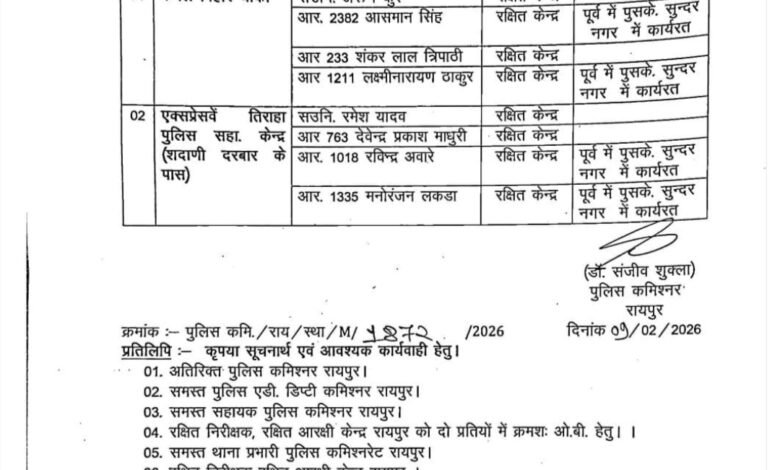 Raipur Police Commissionerate Transfer:–अपराध नियंत्रण को और प्रभावी बनाने और पुलिसिंग में कड़ाई लाने के उद्देश्य से रायपुर पुलिस कमिश्नर डॉक्टर संजीव शुक्ला ने 62 पुलिसकर्मियों को विभिन्न थानों और पुलिस उपायुक्त कार्यालयों में पोस्टिंग दी। इसमें रक्षित केंद्र से भेजे गए एएसआई, प्रधान आरक्षक और महिला आरक्षक भी शामिल हैं।