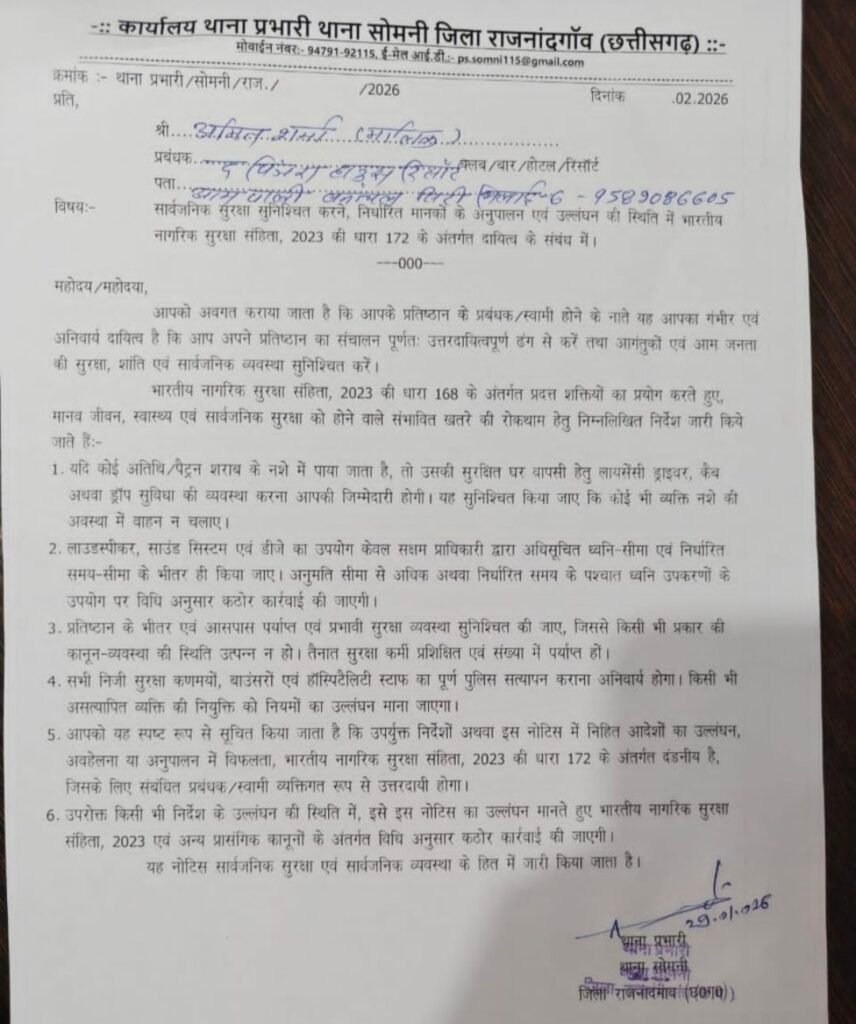 अभियान के दौरान सभी रिसॉर्ट संचालकों को विधिवत नोटिस तामील कराए गए, जिनमें भारतीय न्याय संहिता एवं आबकारी कानूनों के अंतर्गत लागू नियमों का सख्ती से पालन करने के निर्देश दिए गए। नोटिस में यह भी स्पष्ट किया गया कि भविष्य में किसी भी प्रकार के उल्लंघन की स्थिति में संबंधित धाराओं के तहत कठोर कानूनी कार्रवाई की जाएगी।