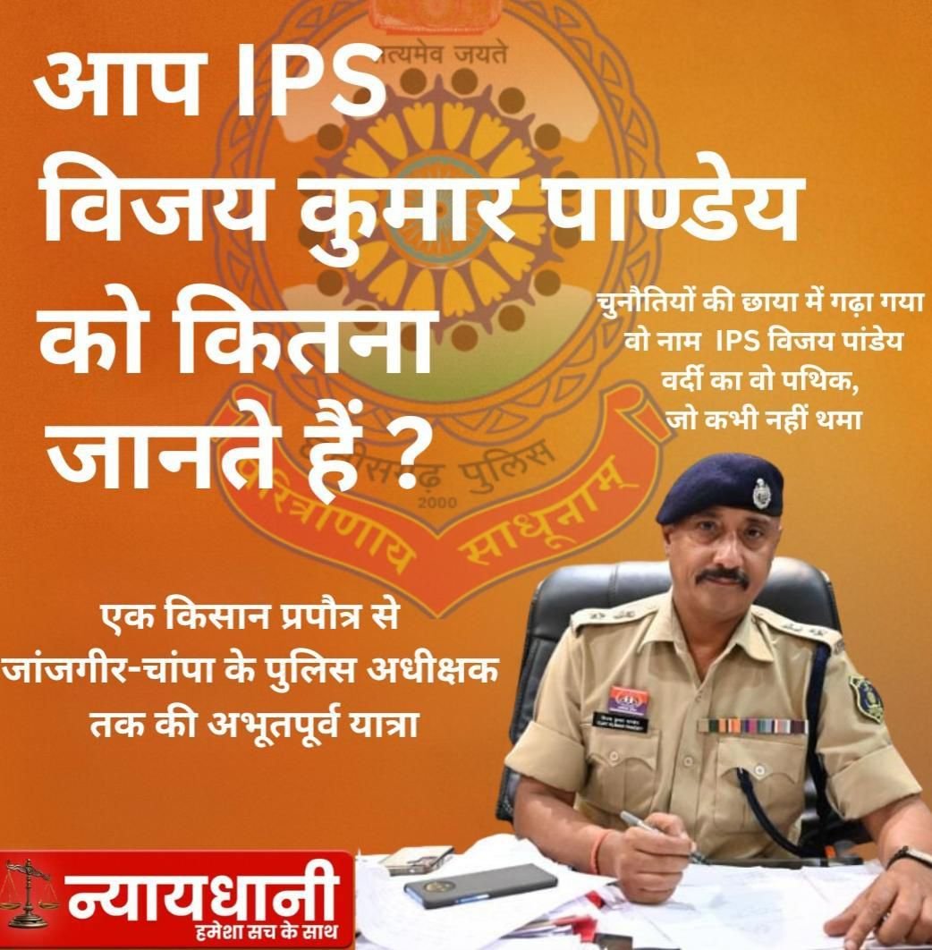 राज्य प्रशासनिक सेवा से आईपीएस बनने वाले विजय कुमार पांडेय उन गिने-चुने अफसरों में शामिल हैं, जिन्होंने जिम्मेदारियों को केवल निभाया नहीं, बल्कि अपने काम से नई मिसाल कायम की। वर्तमान में वे जांजगीर-चांपा के एसपी हैं और बतौर एसपी यह उनका पहला जिला है।